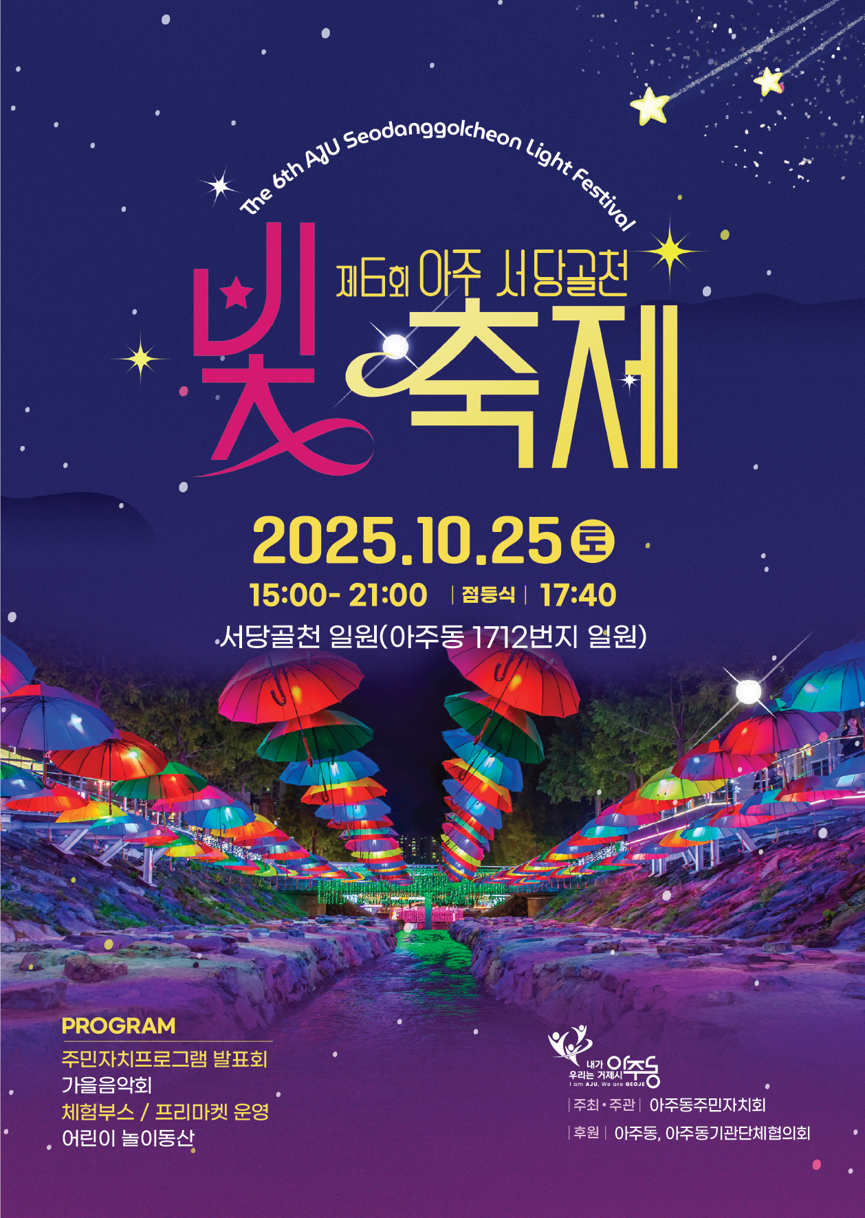 거제도 아주동의 ‘서당골천 빛축제’는 지역의 작은 하천을 중심으로 펼쳐지는 야간 테마형 행사로, 2025년 올해로 6회를 맞이했습니다. 축제는 10월 25일 오후 3시에 개막식을 시작으로, 해질녘 17시 40분경 점등식이 진행되며, 이후 매일 일몰부터 밤 11시까지 불빛이 밝혀집니다. 축제 장소는 거제시 아주동 1712번지 일원으로, 아주동 주민센터에서 도보 5분 거리에 위치해 있습니다.