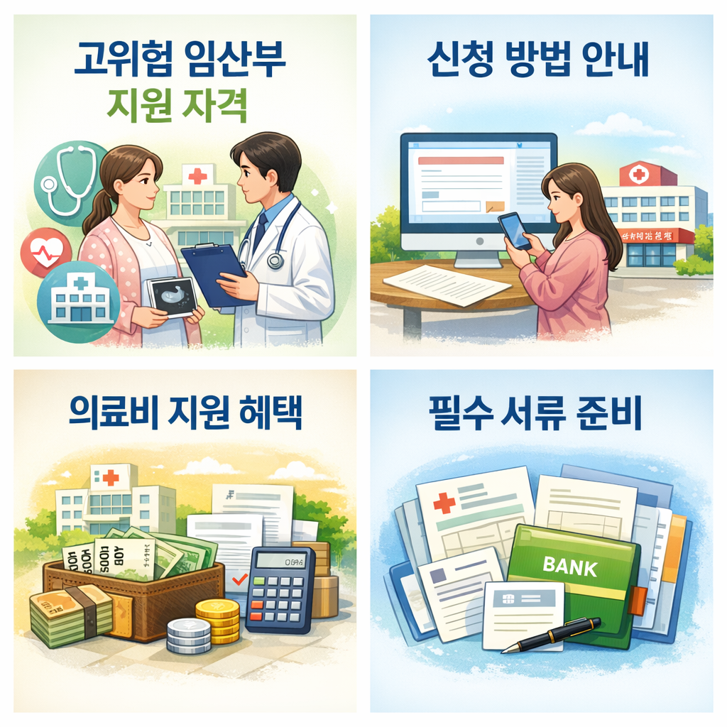 고위험 임산부 의료비 지원은 임신 중 고위험 질환으로 진단받아 입원 치료를 받은 임산부를 대상으로 합니다. 의사의 진단서와 입·퇴원 기록이 필수이며, 조기진통, 태반조기박리, 양막조기파열, 다태임신, 임신성 당뇨 등 지정된 고위험 임신 질환에 해당해야 합니다.